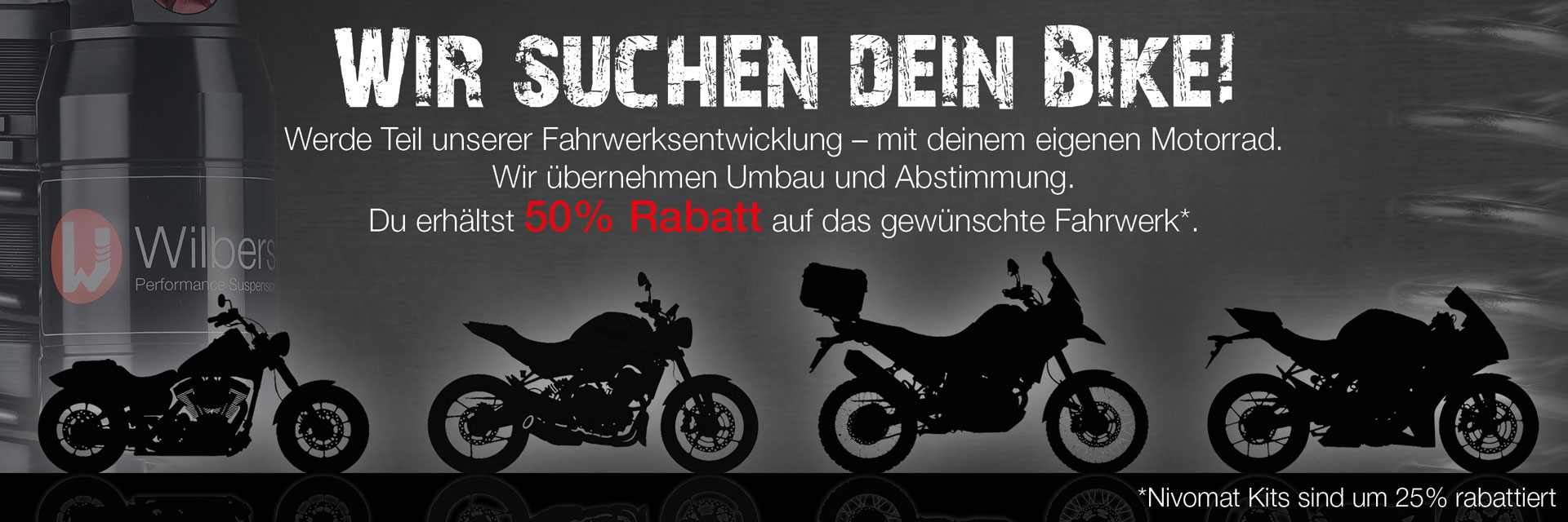 Für die Weiterentwicklung unserer Wilbers-Fahrwerkskomponenten suchen wir ständig neue Motorräder. Wenn du eines der gesuchten Modelle besitzt, melde dich! Wir übernehmen Umbau, Abstimmung, ABE und Co. Dein Bike wird Teil der nächsten Generation Wilbers-Fahrwerke – und du fährst als Erster mit den neuesten Parts.